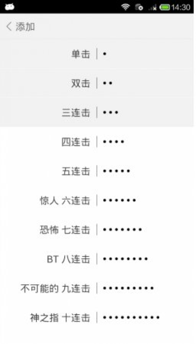 米键的操作原理其实与线控耳机的按键有些相似,从米键APP的主界面我们也能够发现,除了单击动作指令外,还有双击、三连击、长按等多种操作手势,让我们随心设定不同的操作动作。点击界面最下方的“添加”按键,也能够看到米键还能够提供最多十连击的“神之指”。