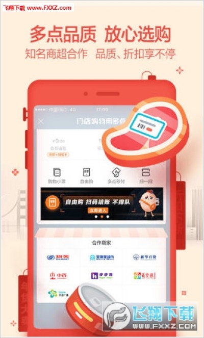 逛超市用多点智能购(自由购、自助收银机、智能购物车)体验购物新方式,最快3秒买单不排队。