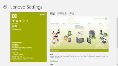 Lenovo Settings Dependency(setting*.exe),这个驱动仅限Windows8安装,不过安装完了,上述这些热键仍然出现之前的问题。不过从名字来看,这并不是一个单独的程序,安装完这个程序之后,还需要去Windows8的应用商店下载一个叫“Lenovo Settings”的Metro应用,即安装如下图所示的应用即可,安装后会发现Fn+F6已经可以使用,而且不仅仅包括以前的摄像头和音频设置,还包括电源、无线热点等设置。