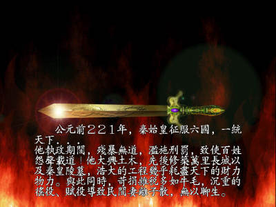 故事发生在公元前211年。秦始皇一统天下后,残暴不仁,为了修筑帝王陵墓与长城,征集了大量的民工,并大肆搜刮民脂民膏,以致民不聊生,怨声载道。为了求得长生不老的仙药,一群所谓的名门正派人物他在各地掳掠童男童女,到处拜仙求药,人间因此陷于一片黑暗混乱之中。主角南宫涛与姐姐在一次采药途中,姐姐离奇失踪,南宫涛为了寻找姐姐就与杜剑衡踏上了江湖之路。一路上,许多江湖志士相继加入他们的队伍之中,一同为推翻残暴的秦王朝而奋斗。最终,经过了许多的波折与战斗,他们在秦皇陵打败了秦始皇,并无意中发现,所谓的万里长城,是秦始皇为帮助他统一天下的“外星人”所修建的飞船导航定位坐标,而秦皇陵是停放外星人飞船的地方,童男童女是供外星人研究所用的。