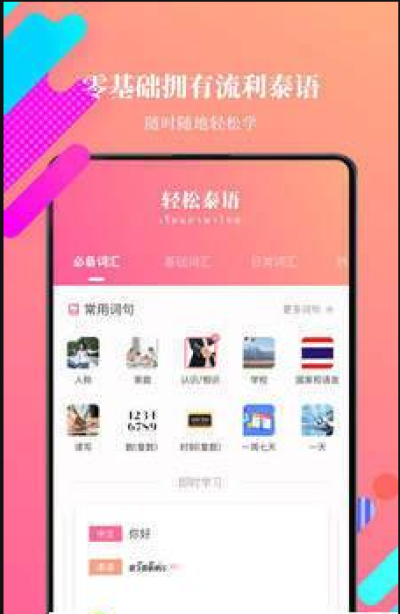泰语学习app,一款帮助你自己在家也能享受专业课程的学习,在这里你可以随时随地的进行在线泰语教程的学习,并且在这里还为你们准备了在线口语测试,感兴趣的有需要的你们都是可以下载使用的。