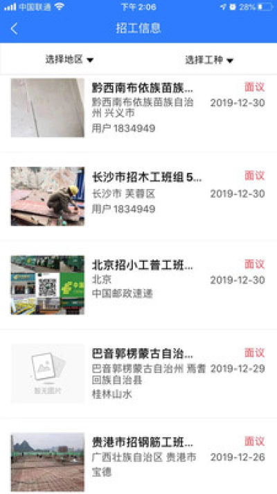 工人找活:发布自定义找活信息,包含类型、区域、自我介绍等具体内容
