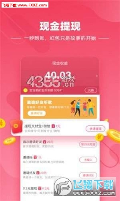 快音听歌赚钱领现金app是飞翔下载今天为各位喜欢听歌的朋友们带来的款全新软件,通过我们的每日歌曲就能获取到自己喜欢的歌曲。听歌之余还能快速赚钱,何乐而不为呢。喜欢的朋友速速下载吧