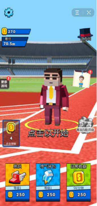 3、利用闯关奖金不能买装备,方块人的背包越来越高级,使用道具不氪金。