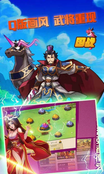 《国战》是一款卡牌收集类游戏,游戏美术风格Q萌。星际掉落10枚陨石,化作力量无穷的神兽玉玺,掉落各个州郡,谁能收集齐这10枚玉玺便能获得无上神力,主宰三国。游戏将瑞兽元素融入到三国题材中,加上颠覆性无节操剧情,给玩家带来与众不同的体验。游戏中独创骑战玩法进一步加大了战场的不确定性。众多著名武一一登场,更融入大量瑞兽元素,让每个武将都能骑乘驯服的瑞兽一同作战,让玩家在瑞兽的帮助下体验微型战争的乐趣。国战,军团战,跨服个人战,你想要的PK都在里面,应有尽有,来开启属于你的王朝吧。