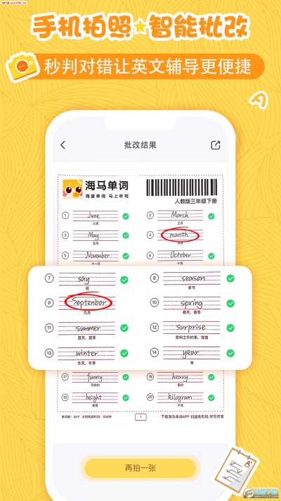 在海马单词听写卡上作答,一键拍照,一秒为您判断对错,老师、家长、学生快速检查听写练习的必备好帮手。