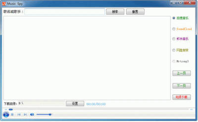 Music Spy(音乐间谍)是一款绿色小巧、功能强大的免费无损音乐下载器,能够在保持歌曲音色音质的前提下将音乐下载到本地。目前支持百度音乐、SoundCloud、虾米音乐、网盘搜索的无损音乐下载。