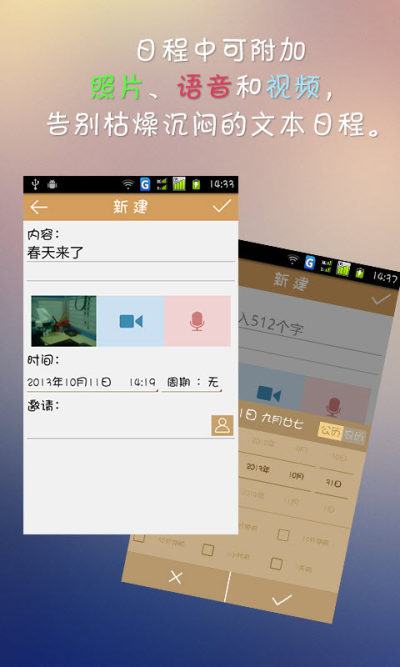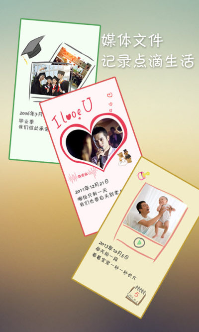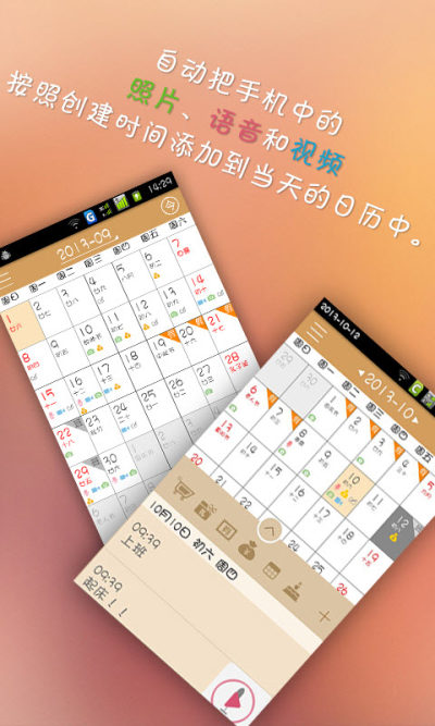自动把手机中的照片、语音和视频按照创建时间添加到当天的日历中。
