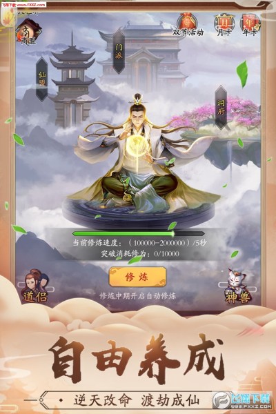 洞府养成生产各种资源。三大副本(常规,剧情,秘境)等你来挑战。斜背一把剑,你可游历天下,发生各种奇遇。深鞠一个躬,你可遍访名师,学道法,做任务,访禁地,闭关做修炼。闲来可炼丹,爽时铸造神兵利器为我所用,还能自己命名。人生何不快哉。