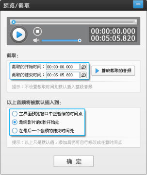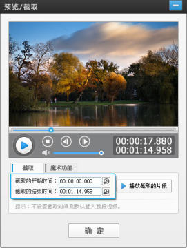 )。如果不需要截取视频片段,那我们可以直接点击“确定”按钮,将视频导入爱剪辑。