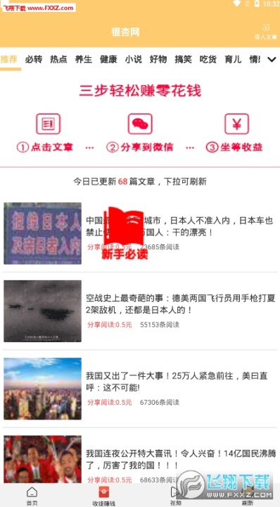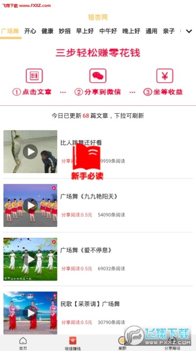 银杏网app是2020年3月11日达中科技公司开发上线的一个转发文章赚钱平台,免费参与分享转发文章就可以赚钱,新手注册送1元,文章点击单价0.5元,文章发到微信群、微信朋友圈、或者也可以发给单个微信好友,平台是按照独立ip地址计费的,首次5元提现。