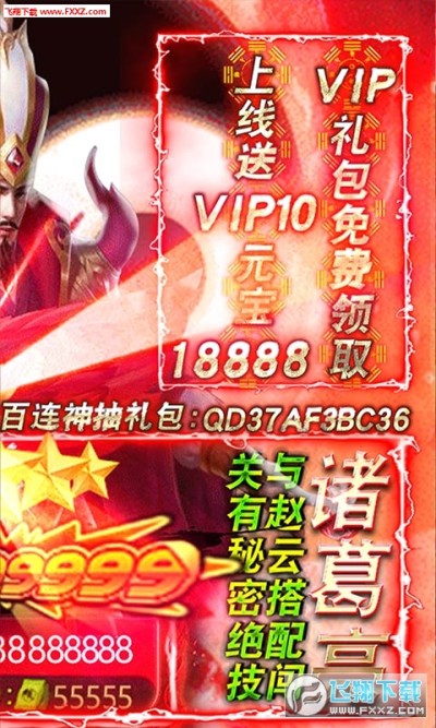 1.上线送VIP10,元宝*18888,VIP礼包免费领取,研发还制作了究极福利:“百抽礼包”,各位主公记得去平台领取百抽礼包码!!