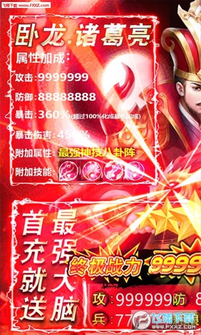 3.首充赠送“三国最强大脑”诸葛亮(与赵云搭配闯关能力惊人哦),首充后还连续送2天诸葛亮的进阶材料,策划的究极关怀!