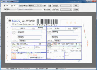 特别说明一下,本软件是套打软件,在不同打印机、不同电脑上、甚至同一电脑上使用不同分辨率,其标签位置显示是不一样的,这就需要针对不同情况,具体情况反复调整标签位置,以达到准确定位之目的。