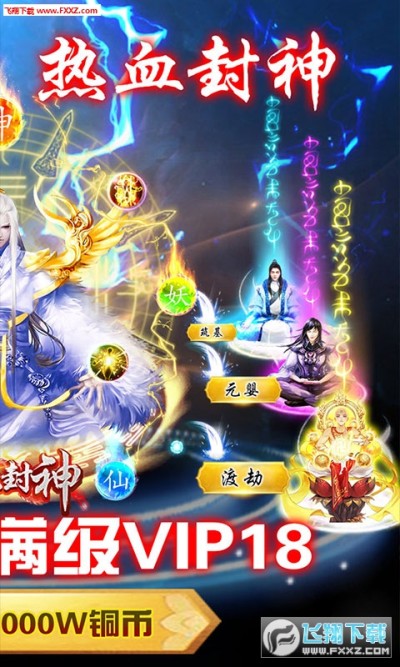 2、上线即送满级VIP18,6W元宝,铜币1000万,助你轻松封神,遨游热血世界!