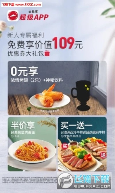 1.新用户可得浓情烤翅,鸡茸蘑菇汤,半价经典意式肉酱面,牛排买一送一等价值109元优惠券大礼包