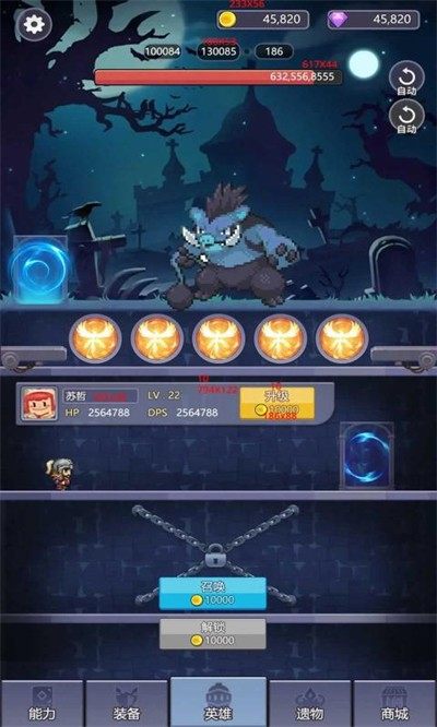 每过十关会遇到关卡,玩家需要在限定的时间内消灭敌人,伤害不够的话则会回到前一关。伤害不够的话,玩家需要积攒资源升级,也可以点击挂机离开游戏,离线获得资源等,回到游戏之后即可升级魔法等,强化攻击力,继续闯关。