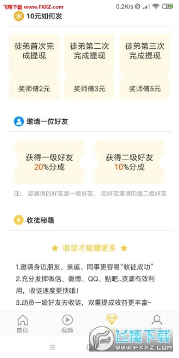 每邀请一名徒弟最高可获得10元的邀请奖励,另外享受一级徒弟20%,二级徒弟10%收益分成