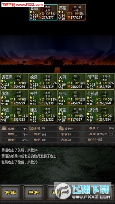 国战线100%是一款以三国为题材的挂机玩法文字游戏,游戏一开始你要选择一个小队来开始冒险,小队里面的人物都是由三国里面的武将角色组成,随着游戏的进行系统会随机触发各种事件,根据不同的发展情况自动触发各种军事指令和各种内政设施。