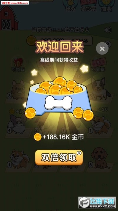 1、成功升级的狗狗是可以获得额外的钞票奖励,如果想要获得双倍领取资格,可点击双脉领取按钮,会弹出小视频或者是广告给你观看;