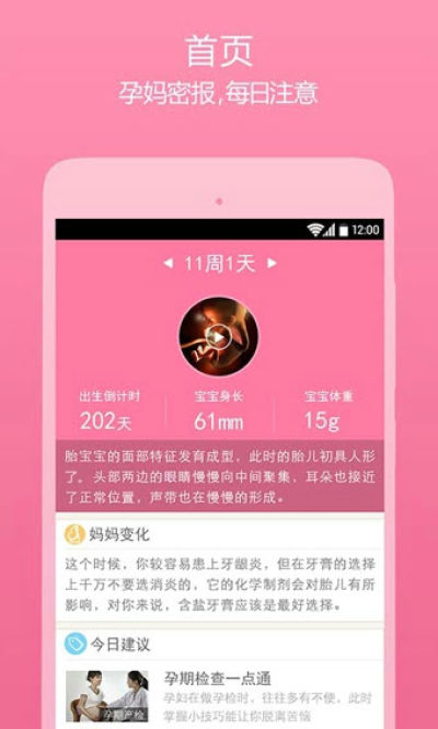 【孕程点滴,随时记录】便捷记录孕期体征,实时关注宝宝最新动态,更有贴心的产检预览、记录、提醒功能,不用担心错过预约产检时间;