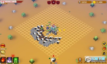 防御塔根据自身的五行属性在不同时间段获得相应的加成,玩家根据选择的阴阳属性在白天或黑夜获得对应的阴阳属性加成作用在防御塔上,不同的时间段加成数值不同。怪物波次冲击玩家的城堡,城堡通过符文科技提升自身血量和防御塔的各种属性加成。城堡被攻破地图上所有的防御塔都将被销毁重新开始游戏,防御塔放置在地图上的等级是固定的,防御塔升级后已放置的防御塔不会升级。