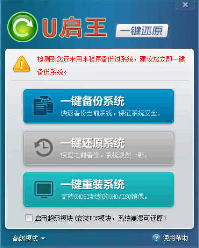 1、在您安装好操作系统和软件之后,然后运行U启王一键备份还原系统,选择一个最佳的系统状态进行备份;当您在日后使用过程中出现系统变慢、系统垃圾过多、系统损坏或崩溃、中木马病毒……任何时候,您只需要启动U启王一键备份还原系统,即刻帮助您还原到您当时您所备份的健康状态的系统。
