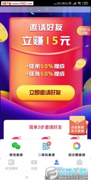 每邀请一个好友可获得15元的邀请奖励(1+2+4+8),新上线期间限时进贡100%(50%+50%)