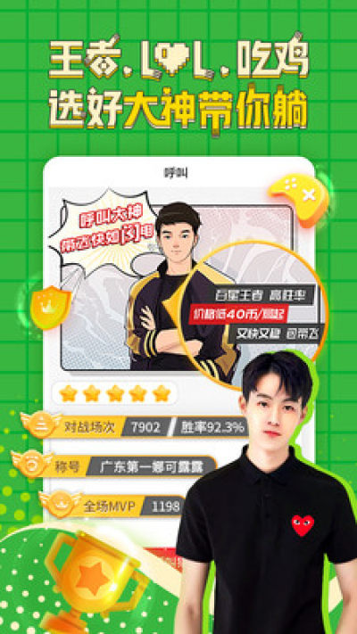 【覆盖当前热门游戏】绝地求生、LOL、英雄联盟、和平精英、云顶之弈、自走棋、第五人格、穿越火线等,由经过严苛考核、实名认证的游戏大神carry,满足快速上分需求!