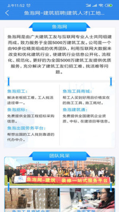鱼泡是建筑、装修行业的一站式服务软件, 通过整合线上和线下建筑行业资源,提供人员招聘、招标采购 、机械租赁、建材工具、二手交易等全方位的解决方案。