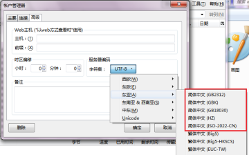 在出现问题的服务器账号编辑页面高级选项中,修改服务器编码字符集,修改成中文对应的编码(推荐GBK)