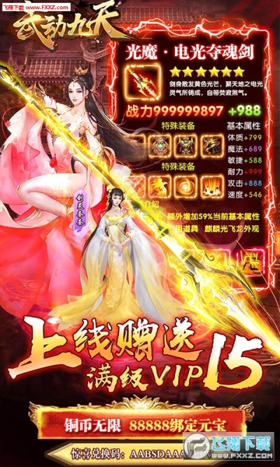2、上线赠送满级V15,88888绑定元宝,铜币无限,一武动九天