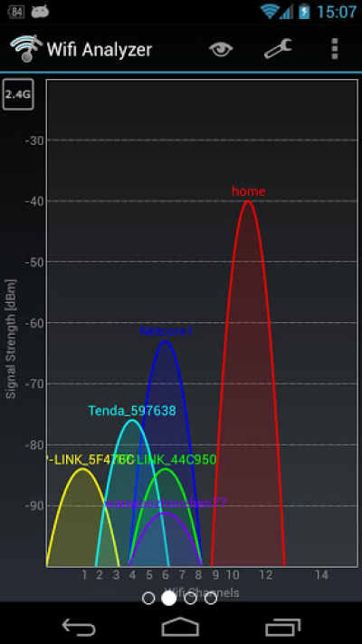 这款WiFi Analyzer手机软件可以将你的Android手机立即变身成为一个方便的wi-fi分析仪,本程序式可以显示您周围的Wi-fi信道占用情况。帮助您为自己的无线路由器选择一个相对空闲的通道以提高连接质量。
