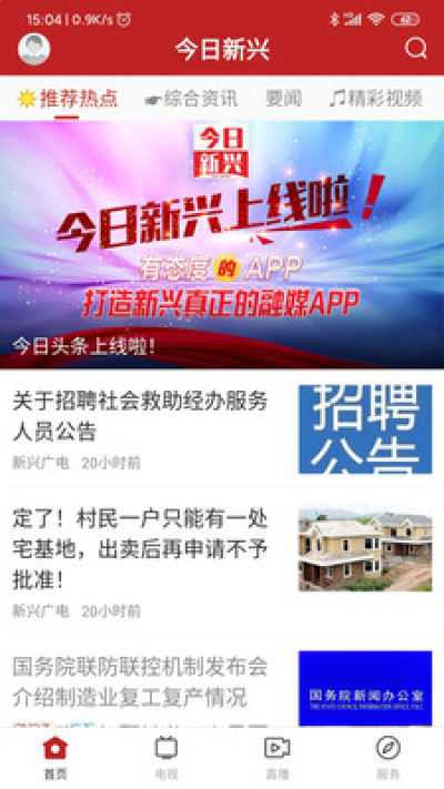 今日新兴app是一款手机融媒体服务平台,主要是针对新兴县打造的,在今日新兴app上各位用户可以查看非常权威的新闻信息,还有本地的热点资讯,政务信息解读等等,在今日新兴app上各位用户还能看电视直播哦!