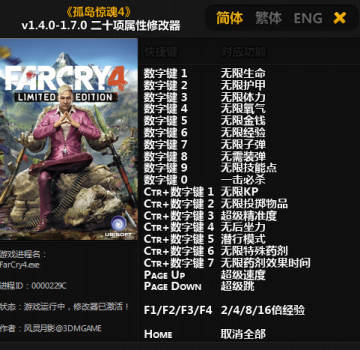 孤岛惊魂4出来有段日子了,玩家们该通关的已经通关,剩下的玩家可能因为不是老鸟,很多地方还是卡着过不去,这里给大家带来一款该游戏的20项修改器,包括了你能想到的所有功能,绝对能让你通关任何难度的关卡了。