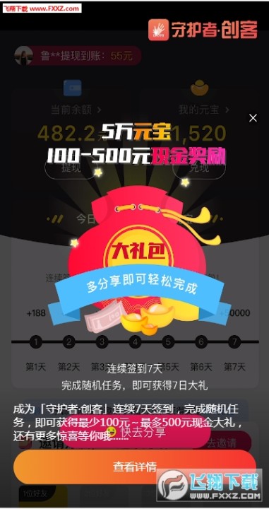 守护者-创客空间,正在空投活动中,用户填写姓名身份号等实人信息注册,然后下载APP安装登陆,绑定微信,每日进入创客空间,连续签到七天必得100-500元现金红包!