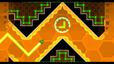 《几何冲刺》的画面基本由不同颜色的单色背景和各种障碍物组成,显得简洁明了。游戏的模式类似横版跑酷游戏,玩家通过操作不断前进的方块进行跳跃来躲避沿途的障碍物最终到达最右端的重点。按理来说这种类型的跑酷游戏难度应该不高,然而如果你真的有这种想法就太天真了,游戏中各种复杂障碍组合以及各种藏在暗处的尖刺配以略快的游戏速度足以分分钟置玩家于死地,而且每一关的长度十分长,稍有不慎就得回到起点重新挑战,玩家又得重新面对那些已经被虐过千百遍的路段,所以在每一关里不死上那么几十上百次都难以过关。