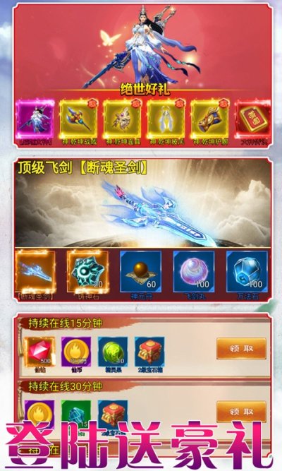 3、首充奖励豪华升级,送绝版飞剑、橙色超萌精灵、极品仙器助阵,一步登天嗨爆全场!
