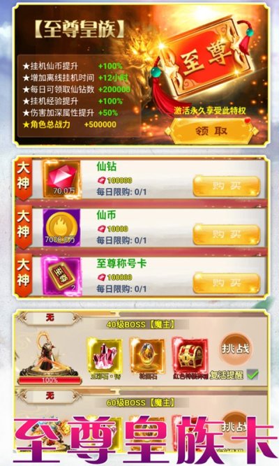 仙魔奇谈至尊皇族满v版是一款玄幻修仙题材的ARPG类手游,游戏里玩家体验激情爽快的养成玩法,一键挂机升级飙升战力,上线就送满v福利和至尊皇族卡,打造炫酷的羽翼翅膀和神器装备,感受紧张刺激的仙侠对战体验,喜欢的小伙伴快来下载试试吧!