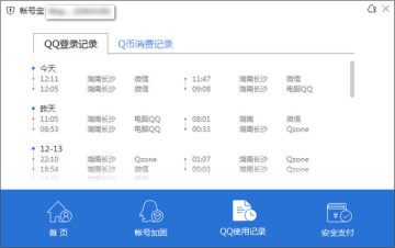 帐号宝中可便捷查看QQ登录记录、Q币消费记录