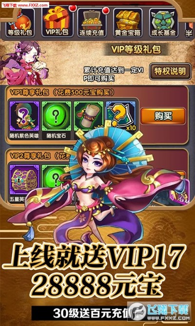 1、上线就送VIP17,28888元宝及百万铜钱!