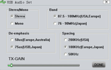 发射频率范围是 76~108MHz, 你可以选择调谐的步进在50KHz、100KHz和200KHz之间.