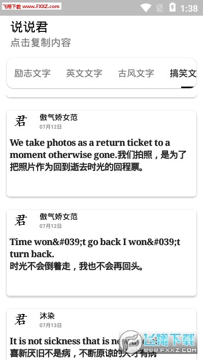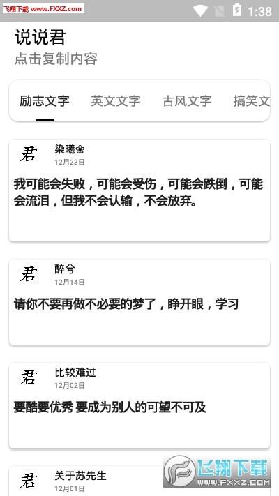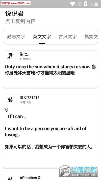 说说君app平台里面汇集了海量优质的说说短句,各种类型的短句都可以在这里直接找到,用户还可以直接在线进行搜索自己想要的短句,然后就可以发表到自己的空间,每天平台都会实时的更新美文短句,用户可以随意在线进行挑选,让你的空间说说每天都是不一样的。