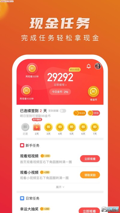 进入『任务』区可直接提现,火火视频极速版首次提现0.5元起,后续提现1元起。对于想赚多点钱的人可以等赚够10000金币再提现,下面任务区有很多任务可做。