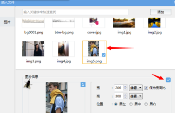 5、点击插入快捷按钮,在弹出的选框中,点选需要插入的图片(可多选),设置图片展示的位置及大小,点击“确定”插入图片。(图片大小可以设置为像素,或者屏幕百分比)