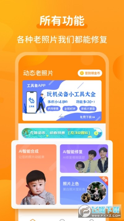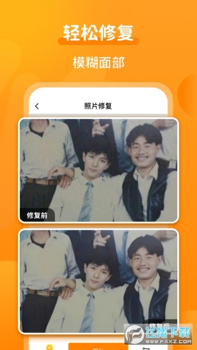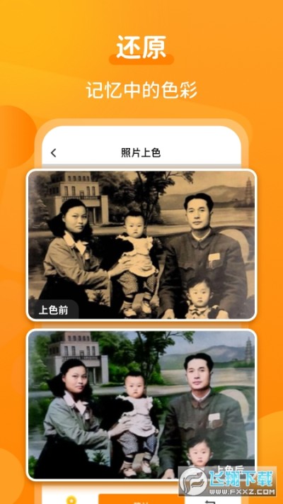 动态老照片免费软件使用人工智能技术对旧照片进行修复和着色,并自动合成照片和视频。同时,您可以调整视频的措辞和音乐。该软件可以自动识别照片中人物的五官,修复五官,高度还原原始五官。普通照片修复,编辑模糊画质,高度还原场景细节,画面清晰自然,唤醒旧记忆。软件可以修复旧照片、损坏照片、旧照片、轻微损坏照片。