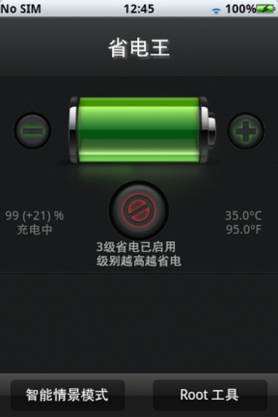 打开软件,点击 > 按钮以启用省电王,使用+、-按钮来调节想要的省电级别即可。1级省电级别最低,大约可以为你增加5-10%的电量,3级最大,大约为你增加30-60%的电量,增加多少电量会根据每部机器的不同而有所改变的。当你不想使用时,按下中间红色的禁止按钮即可。