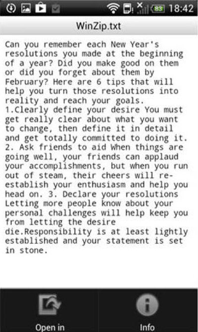 - 直接在WinZip应用中接收zip文件并浏览支持的图片、文本和网页文件,使用设备上集成的第三方应用轻松打开其他常用文件格式