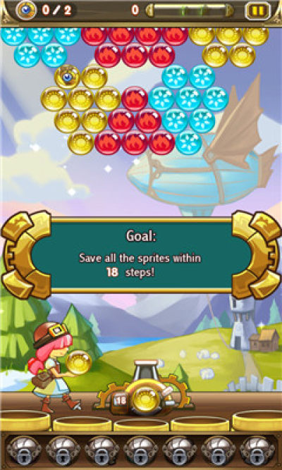 和一般泡泡龙游戏的玩法一样,只需要将相同颜色的珠子打在上面一样颜色的珠子上就可以消除。玩家也可以点击小女孩进行球的颜色的交换。