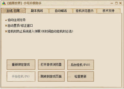 自动主线任务、自动置顶/修正窗口、挂机时防止系统进入休眠(长时间自动挂机时必选)、副本挑战、自动喊话、挂机状态显示